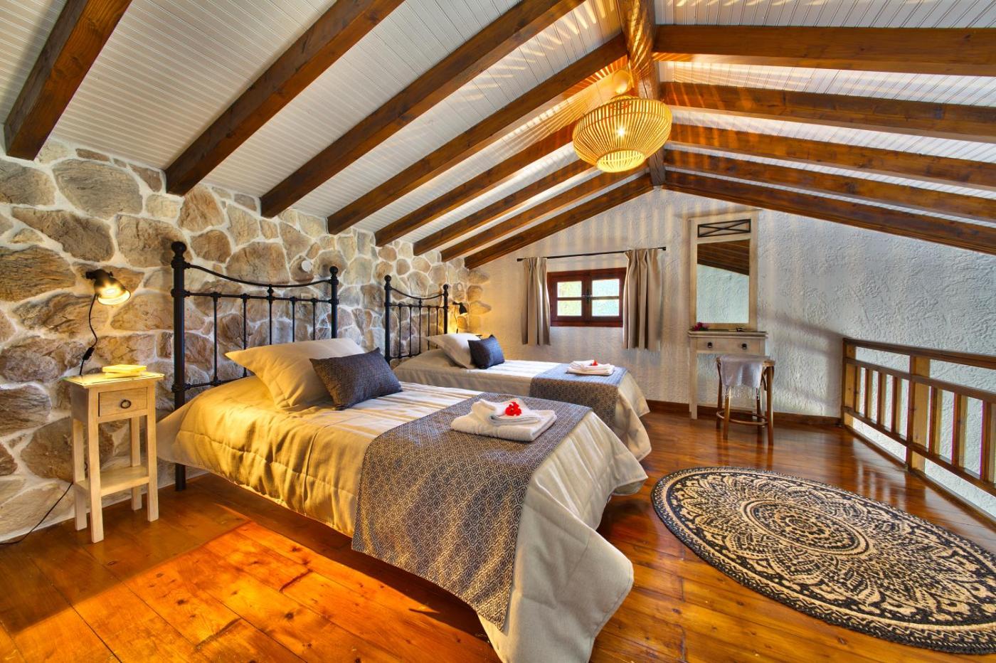 Two-Bedroom Villa. This villa boasts panoramic views of the Ionian Sea from its furnished balcony. It features stone-paved floors and offers: -kitchenette with cooking hobs and fridge -seating area -2 bedroom -2 bathrooms, each with a shower Air conditioning is available upon request. Please note that the maximum occupancy of 4 guests, suitable for a family 2 adults and 2 children