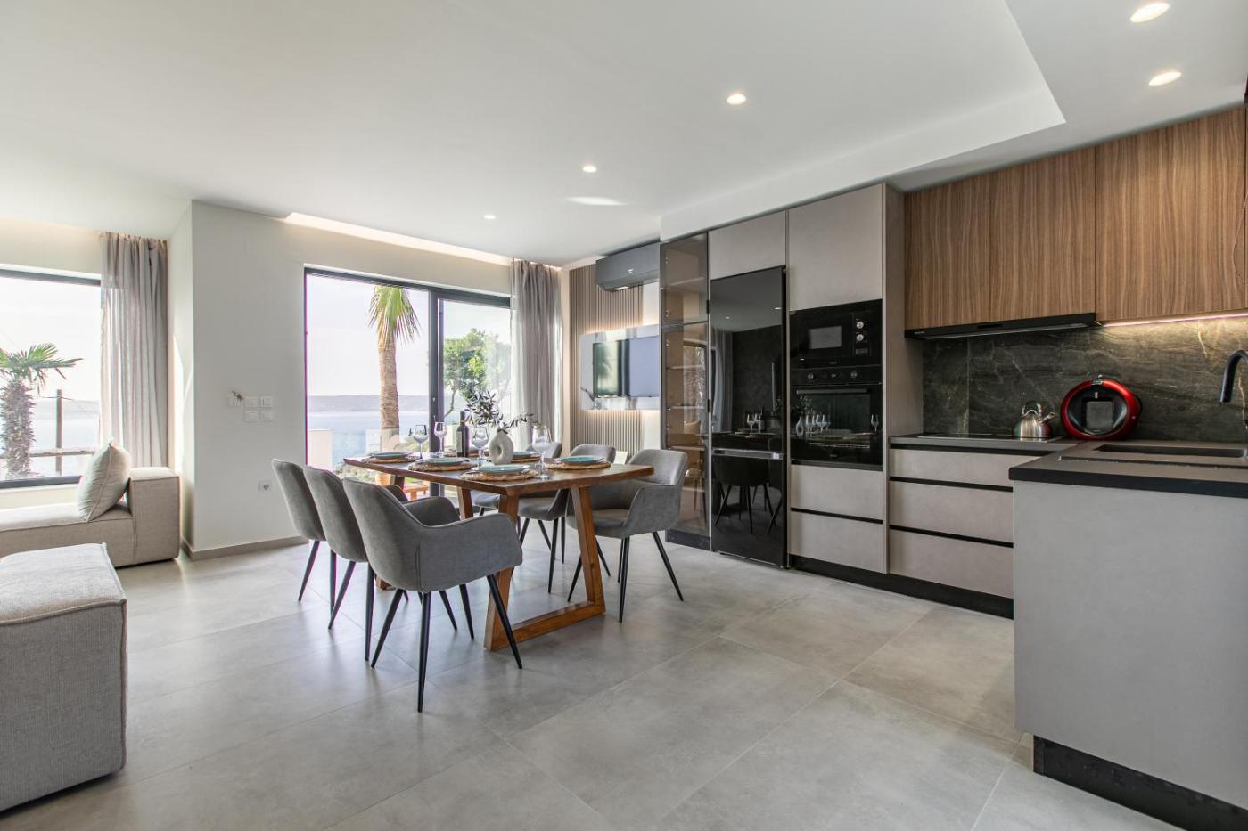 Three-Bedroom Villa with Private Pool. The air-conditioned villa features an outdoor swimming pool, sun terrace and balcony overlooking the sea, garden and mountains. The first floor includes a fully equipped kitchen with stove, microwave and dishwasher. The spacious living room comes with a flat-screen TV with satellite channels and DVD player. A bathroom with bath and shower is also provided. The second floor includes 2 bedrooms and a second bathroom. Free Wi-Fi is offered throughout.